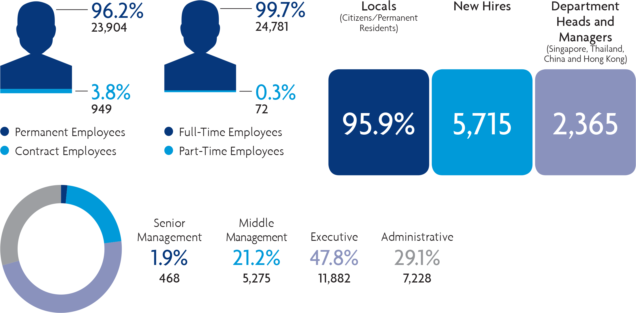 Females accounted for 61.9 per cent of our permanent employees as at the end of 2016 and 57.5 per cent of all the hires in 2016. In Senior Management and middle management roles, women made up 35.9 per cent and 52.1 per cent respectively. They also account for 47.4 per cent of department heads, who are Senior Management reporting directly to the Group CEO or a Country CEO, in Singapore, Thailand, China and Hong Kong.