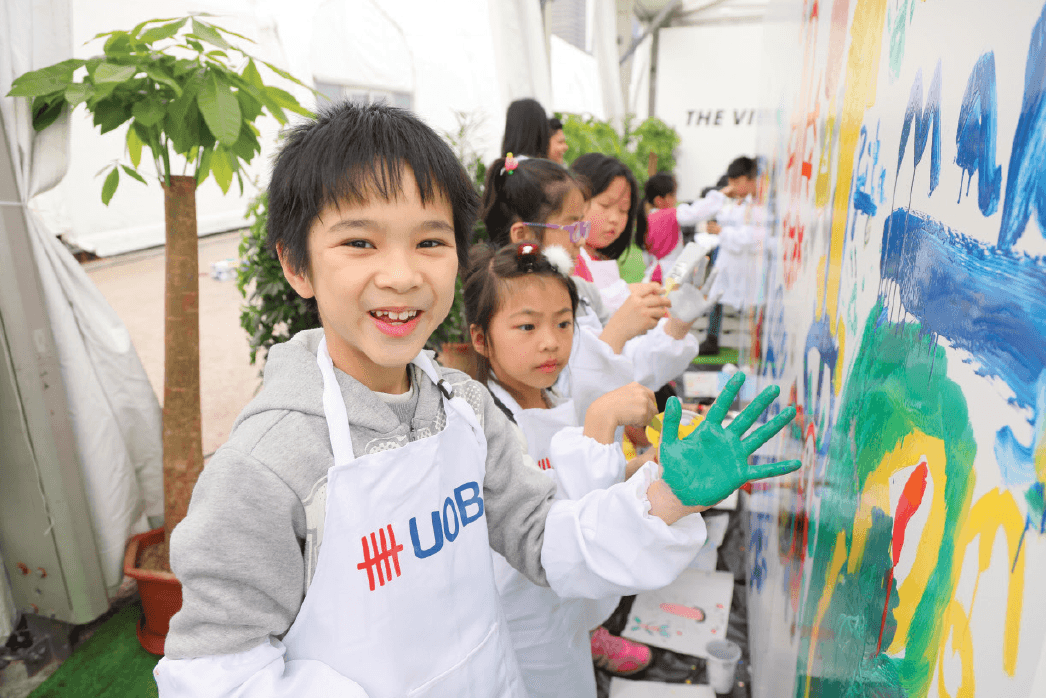 As part of our art outreach efforts, in 2017 we conducted seven UOB Heartbeat art workshops in Singapore for more than 250 underprivileged children and those with special needs. We aimed to help them express themselves more confidently through art. The workshops led by our UOB POY artists included acrylic and watercolour painting sessions and a special food art workshop by popular bento artist, Little Miss Bento. We also brought children to the National Gallery Singapore to experience the Children’s Biennale and the Yayoi Kusuma: Life is the Heart of a Rainbow exhibition.