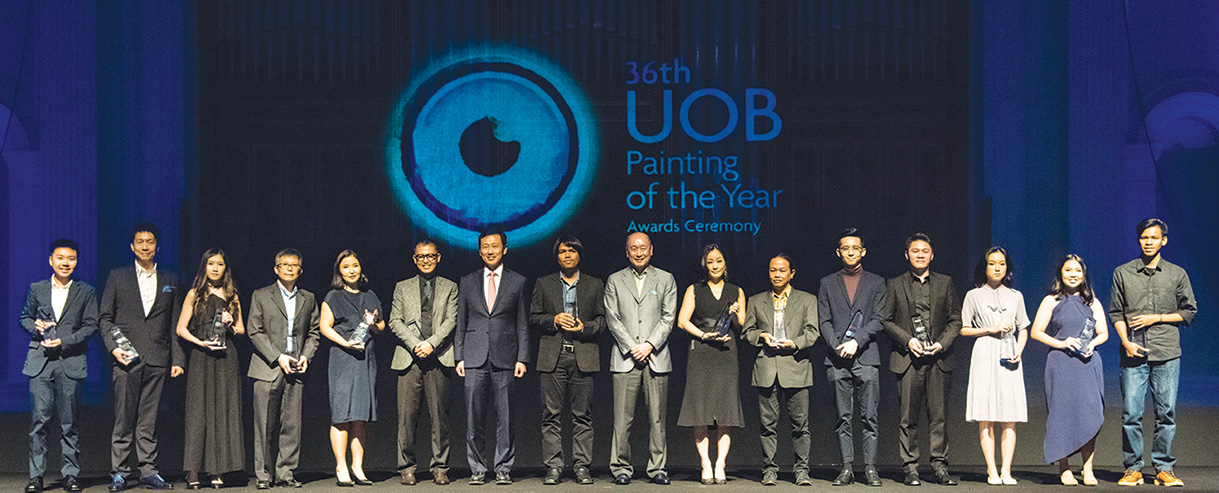 The regional and country winners of the 36ᵗʰ UOB POY competition against a backdrop inspired by the winning regional painting from the year before.