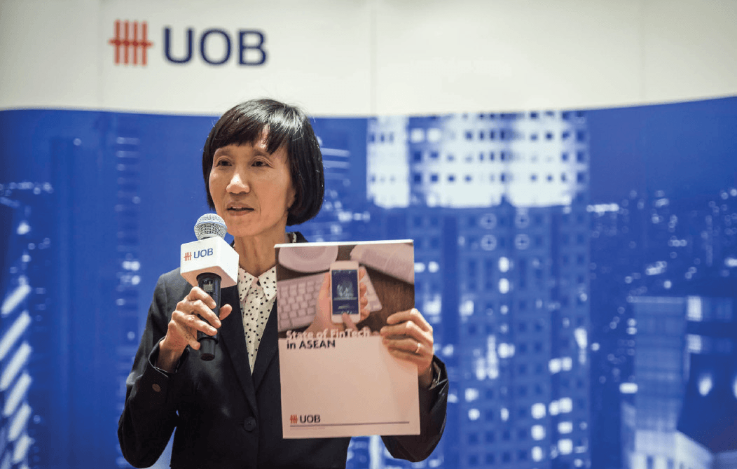 Ms Janet Young, Head of Group Channels and Digitalisation, holding a copy of the State of FinTech in ASEAN white paper at a UOB networking event for venture capitalists and FinTech start-ups.